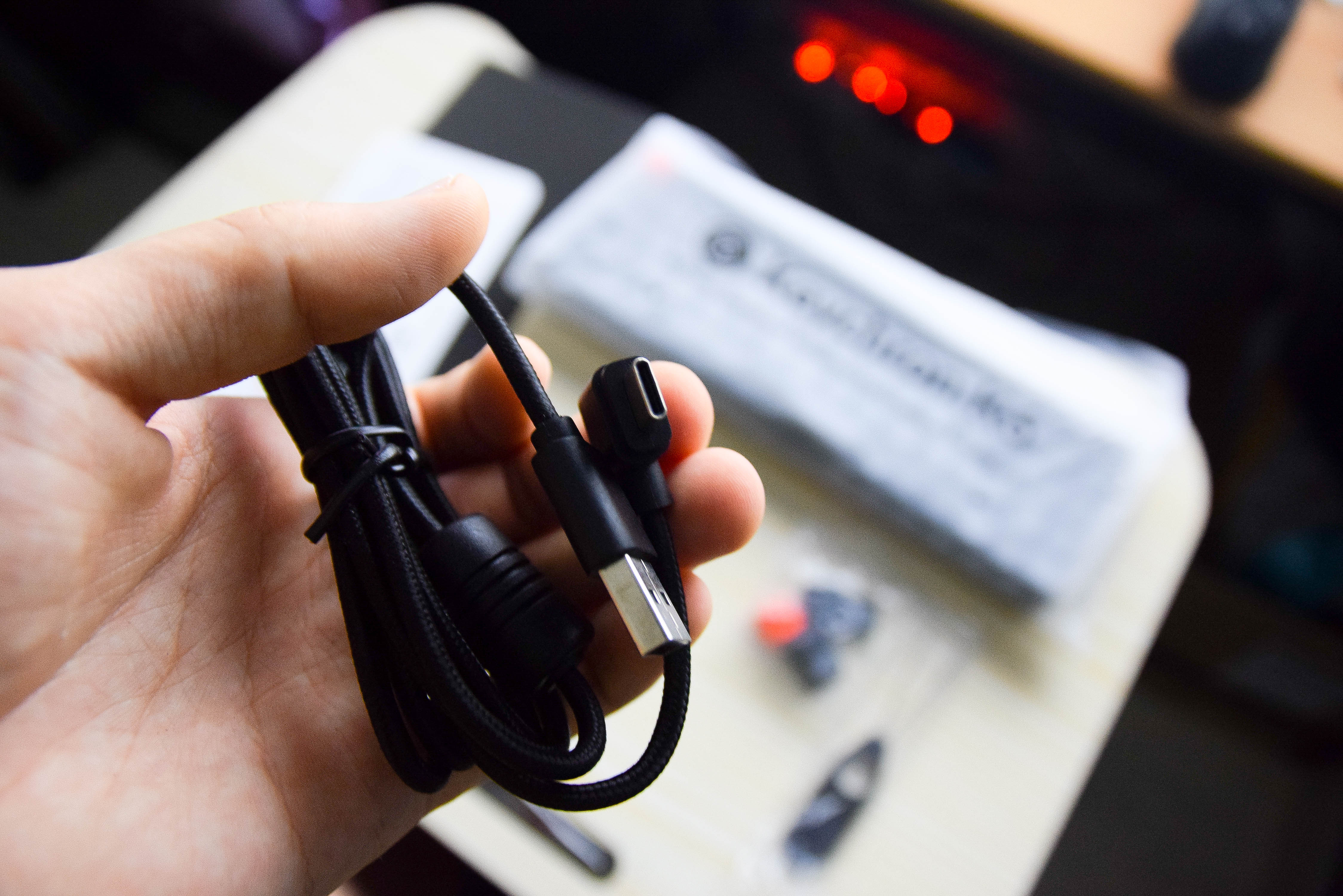 유선 연결 용 및 충전용 A to C 타입 케이블과 와이어 리무버, 여분 키캡들이 제공된다.