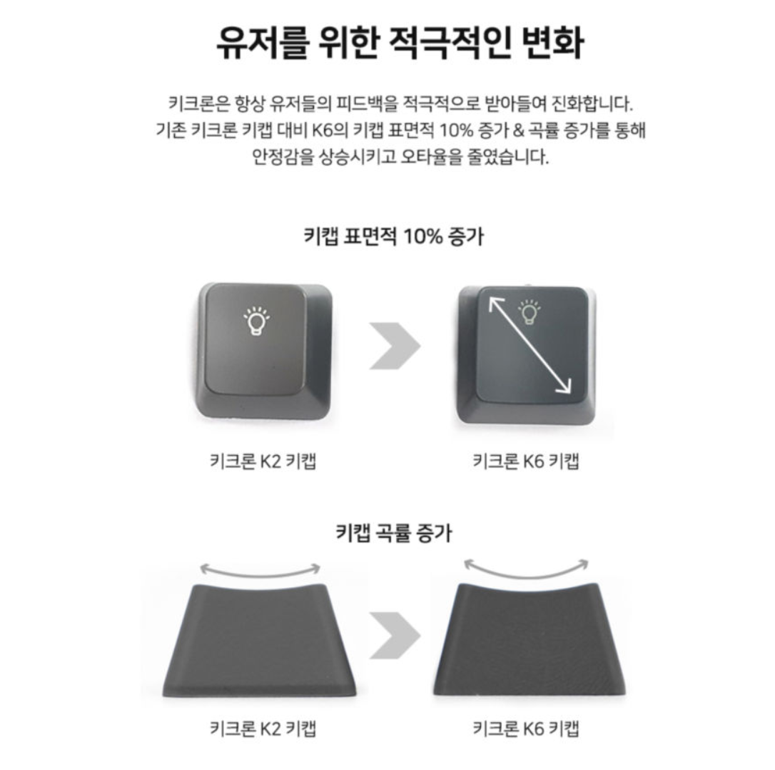 사용자의 편의성을 위해 기존 키캡 대비 키캡 표면적을 10% 증가하고, 곡률을 증가 했다고 한다.