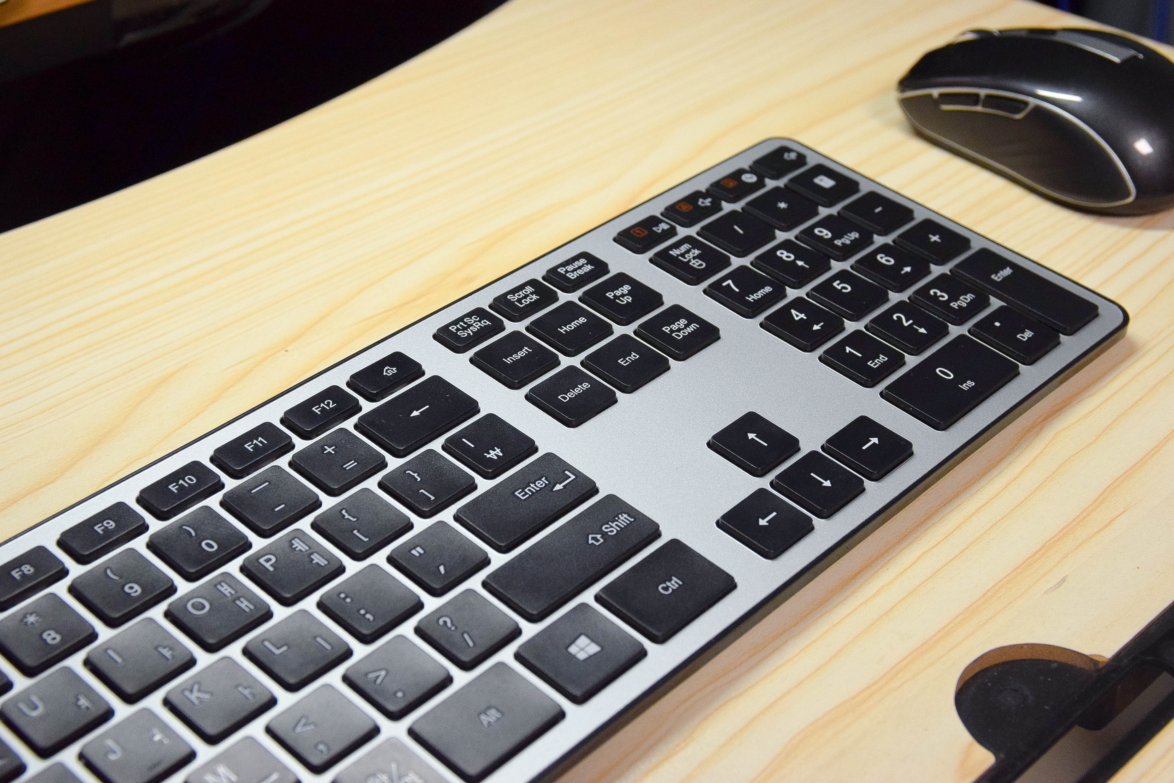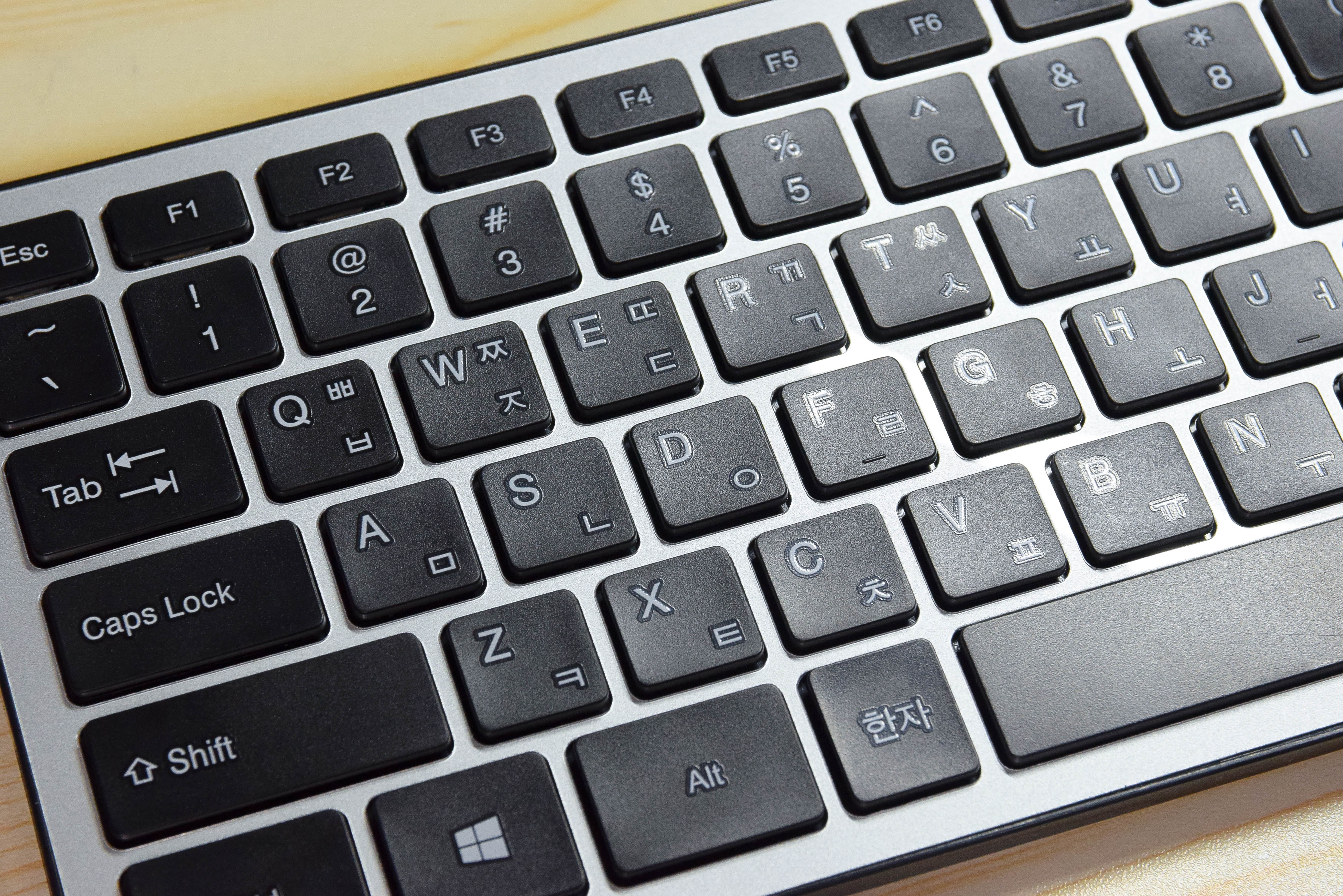키보드는 전체적으로 알루미늄 메탈 느낌의 디자인으로, 유광 재질의 하우징을 가진다.
