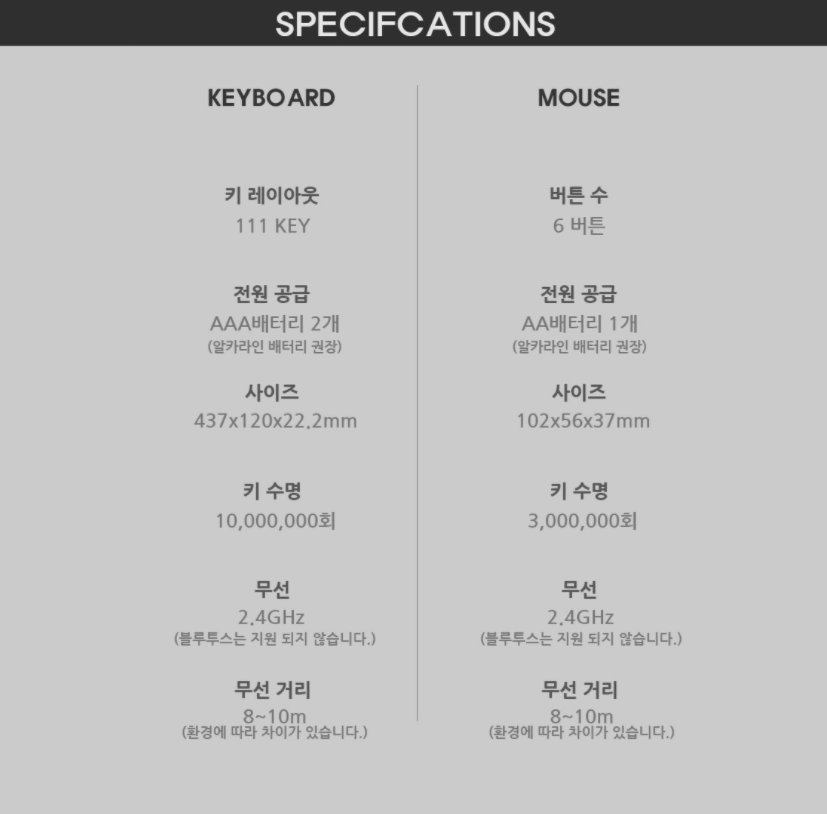 AA 배터리 한 개가 사용되며, 무선 동글이는 마우스 내부에 수납 가능하다.