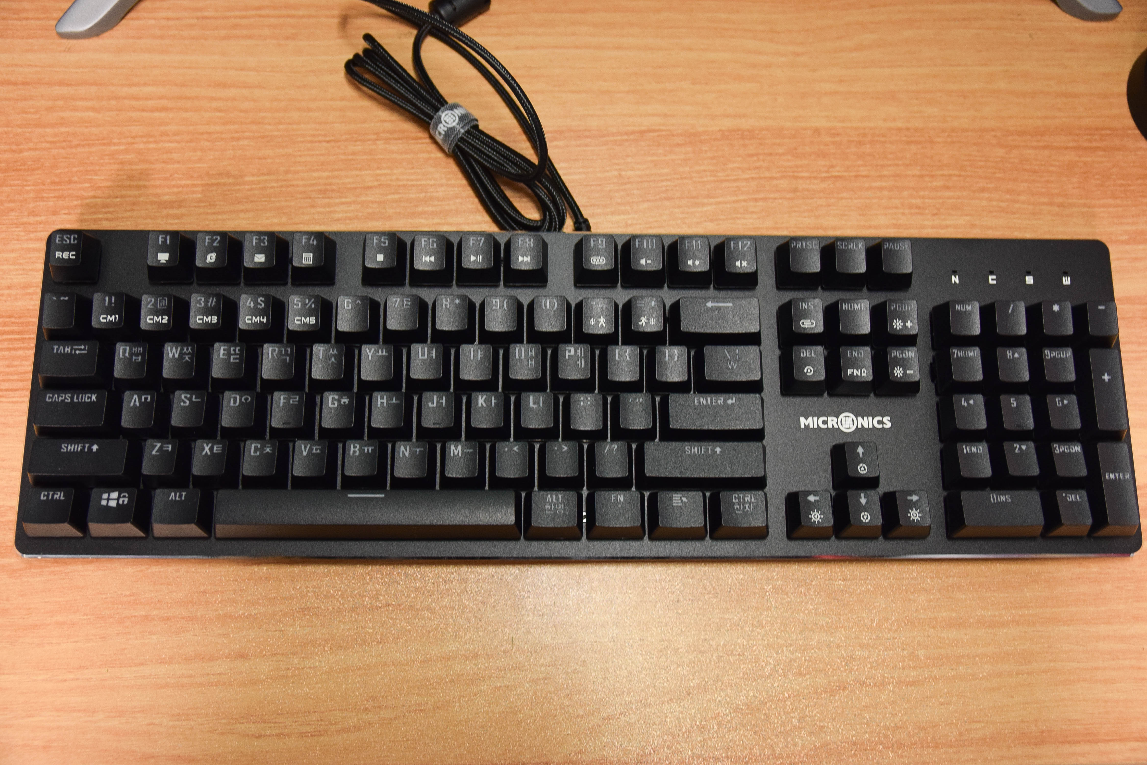 키보드는 검은 색상의 베이스에 흰색 글씨로 마이크로닉스 로고가 각인되어 있다.