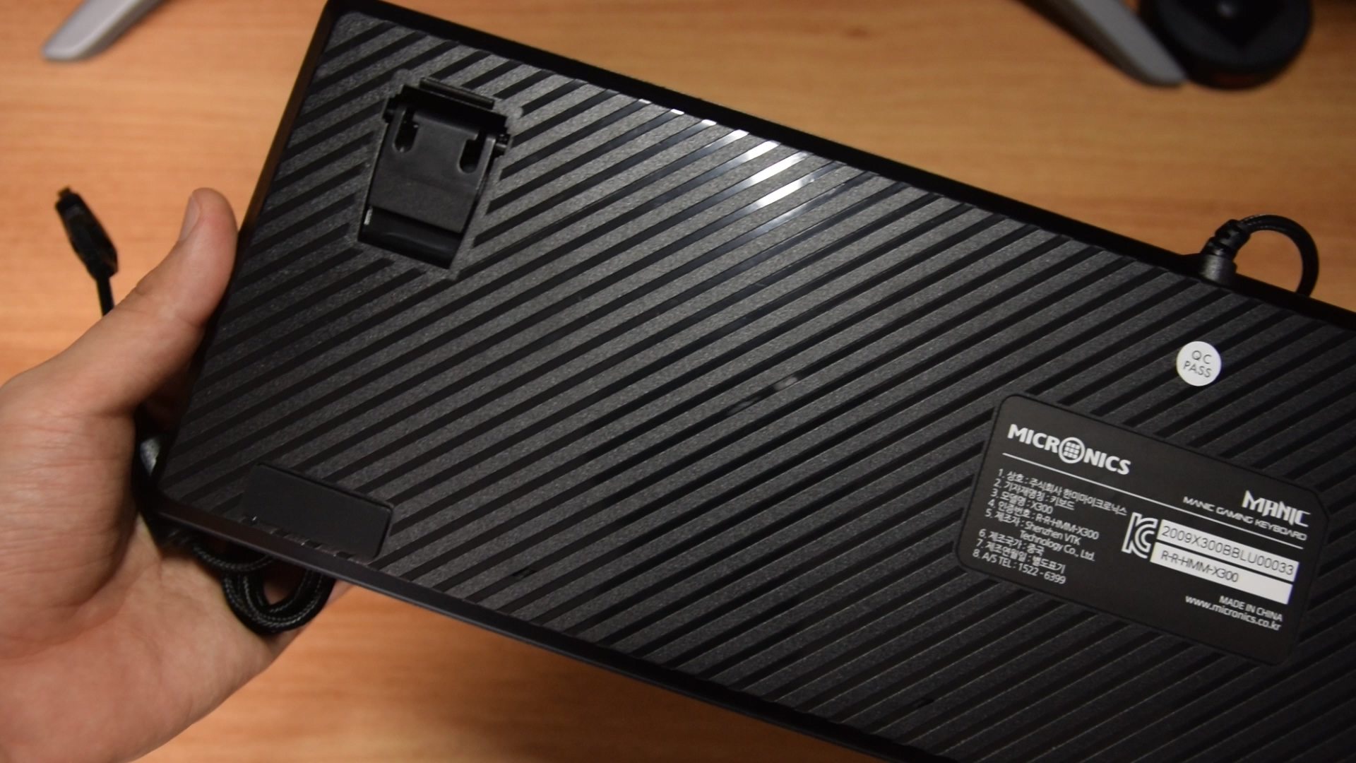 키보드 하단부는 빗금무늬로 포인트를 주었고, 2단계로 조절 가능한 키보드 다리가 존재한다.
