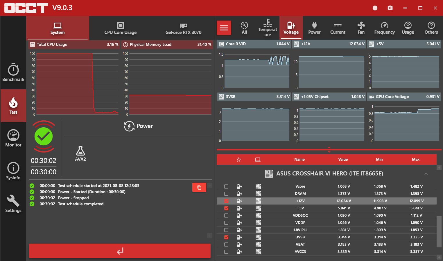 OCCT 프로그램을 이용하여 30분간 부하 테스트를 진행하였다.