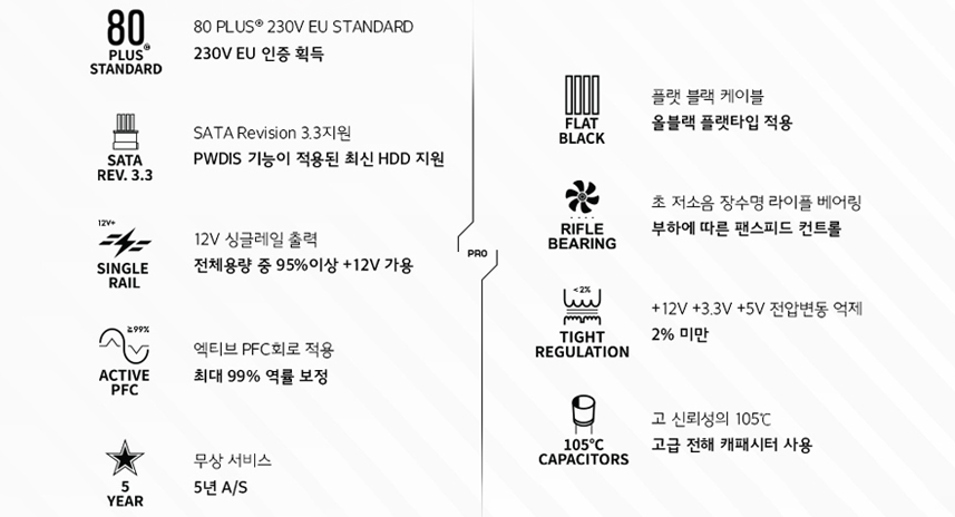 80 PLUS STANDARD 인증을 획득했으며, +12V 싱글 레일 출력으로 안정적인 전력 공급이 가능하다.