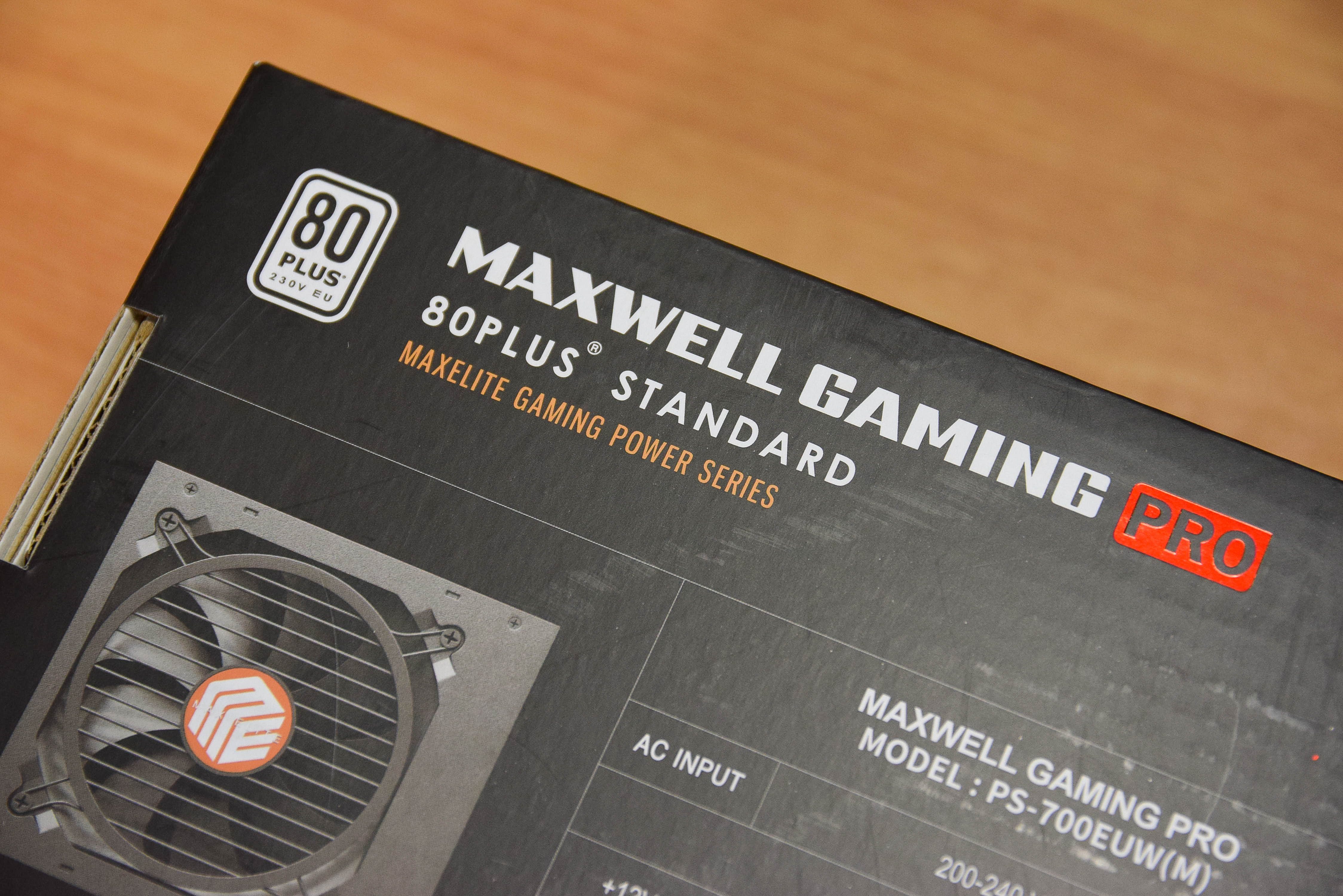 맥스엘리트 MAXWELL GAMING PRO 700W 80 PLUS STANDARD 플랫의 전면 모습을 강조하며, 제품의 특장점들은 간단하게 표기하고 있다.
