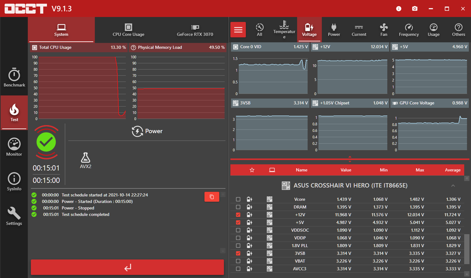 OCCT 프로그램을 통한 15분간의 부하 테스트 결과이다.
