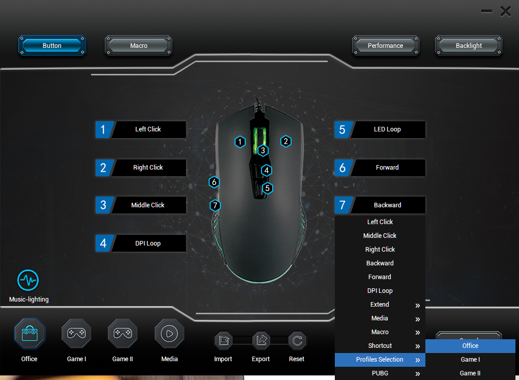 DPI 버튼, LED 버튼 까지 포함한 총 7개의 버튼을 전용 소프트웨어를 사용해 커스터마이징이 가능하다.